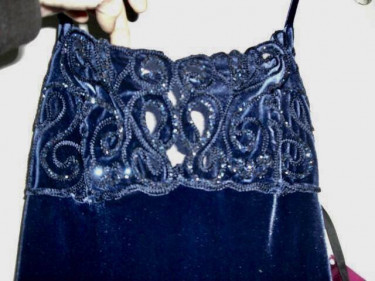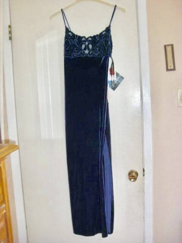 It is a beautiful sapphire blue velvet full length evening gown. It has sequin embellished bodice with spaghetti straps and a long slit up the side. Designed by Zum Zum it sold originally for 160.00 at Dillards. It was marked half price and I found a small area that had come unsewn on the seam (about an inch...