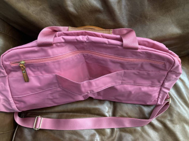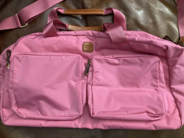 Bric's Luggage X-Bag 18" Pink Boarding Duffle with pockets; nylon with brown leather trim, goldtone buckles; $35- NEW CONDITION: kept in the back of a closet in a box for a few years and never used DIMENSIONS: 18.1" x 9.4" x 8.7" KEY FEATURES: ----- Interior organizational, zippered pocket ----- 2...