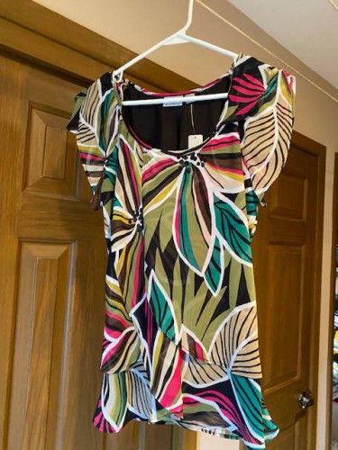 Misses Size M. Polyester machine washable top with black lining. One piece. Layered look. Greens, black, and beige coloring. New with tags. Originally sold for $36. Cash and carry. Other NWT misses clothing items available.