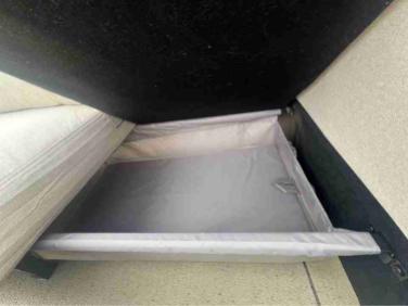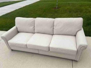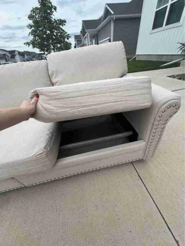 Cream with under seat storage. Very comfortable! Would be great for an apartment in need of extra storage or a play room.