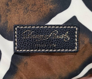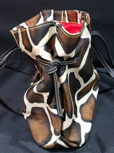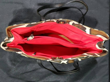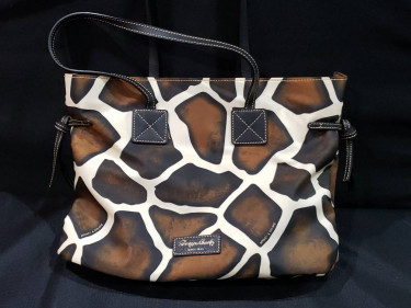 AUTHENTIC Dooney & Bourke giraffe print hand tote with brown leather handles, gold snaps, and gorgeous paprika-red fabric lining. Given to me as a gift, but never used. Super Cute lightweight purse. Hand made in Mexico -- all tags/logos attached and legit. DETAILS: 3 interior pockets, center zip com...