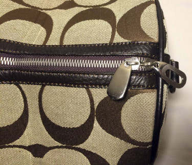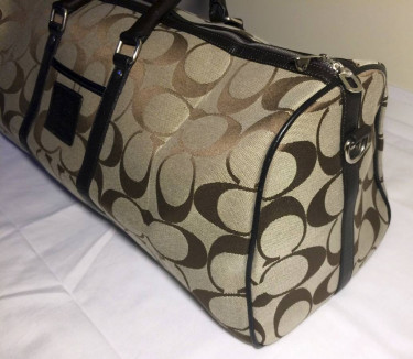 New Coach style/replica canvas/fabric weekender duffle travel bag with double leather handles and leather accents. - Top zip closure - 1 interior pocket with zip - 1 exterior small pocket on the front - Leather trim Decorated with silver tone hardware. Lightweight. Lined. No shoulder strap. ...