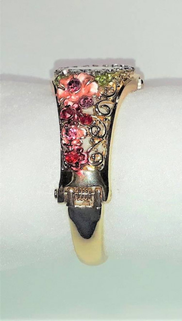 Luxury Crystal Retro Garden Flower Bangle Bracelet Watch - Pink This beautiful quartz bangle bracelet watch has pink 3D flowers with colored crystal stones and the round face is circled with white crystal stones. It opens on the side and has a spring closure. This retro style watch can be worn for formal or ...