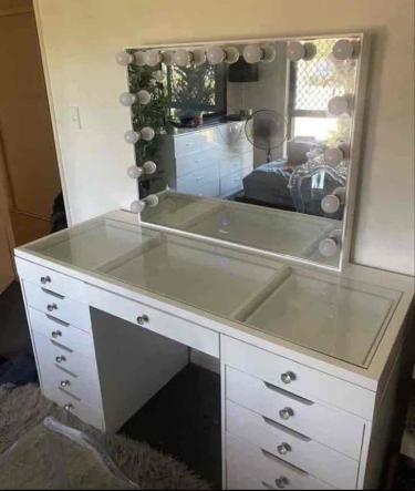 Vanity Desk with Power Outlet, Makeup Vanity with Mirror and 12 LED Lights, 3 Lighting Modes,8 Drawers Vanity Table with Chair, Glass Top, Vanity Set for Bedroom,Dressing Room l(White). You never use it has some exterior details that I already touch up. Already assembled and ready to go.Thank you!