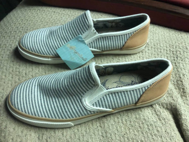Lowered price $100 cash Firm. Pick up only. RIP Jimmy Buffet. Calling all Parrotheads!!! Hard to find. Size 7.5 Leather Heel Backstay. Floral Tropical Print Lining. New Margaritaville Womens Blue Striped Canvas Slip On Shoes Loafers Sneakers Flats. They even have Parrots on the bottom!!! Please check my loca...