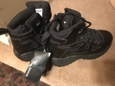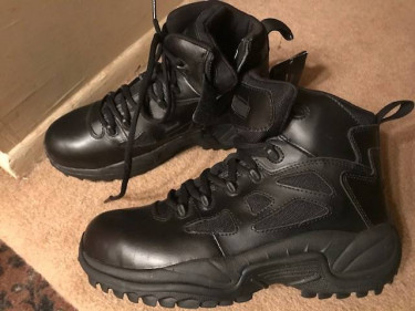 NEW and NEVER WORN - All Black Rebok Leather Work Shoes. XTR Composite Toe Caps for strong and lightweight protection. Will not conduct heat, cold or electricity. Conforms to ASTM F2413 Standards. Airport Friendly - will not activate most airport metal scanning devices. Foot Force F2A Athletic Inso...