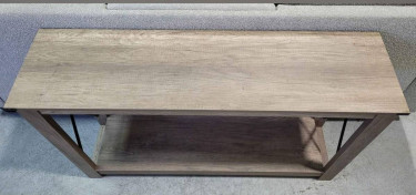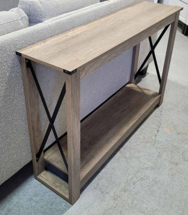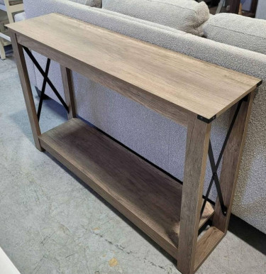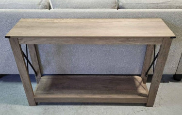 New Length : 46 in Width : 12 in Height : 30 in Materiel MDF The inviting, warm beige color on the melamine finish will make it fit right in to a coastal vibe while the straight-lined shape will also be equally at home with modern farmhouse style. Sleigh legs wrap around side of sofa table, table have...