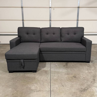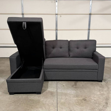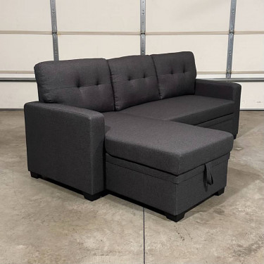 New, never been used, in perfect condition, storage sofa bed sectional in dark gray. Just removed it from its original shipping boxes to take the pictures. Has a chaise that can be placed on the right or left side with storage inside and a pull out sleeper. Overall dimensions are 82”W x 54”D x 34”H. Willing t...