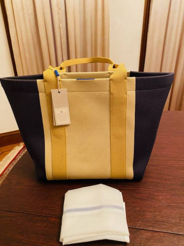 New unused The Essential Tote by Rothy's in color scheme Ink and Ivory, comes with protective cover. Durable top handles in light camel comfortably fit over the shoulder. Spacious enough to fit your 15” laptop. Includes interior zip pocket and protective bag to feet help prevent scuffs. This bag is made with ...