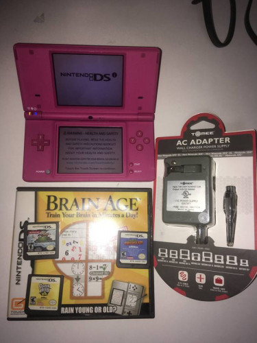 nintendo dsi (candy pink?) with charger (bundle #1) handheld comes with 4 games yu-gi-oh! 5d's stardust accelerator(cart only) brain age: train your brain in minutes a day (with case and manual) guitar hero: on tour shrek super slam SELLING AS A BUNDLE ONLY WILL NOT SELL ANYTHING SEPERATELY PRICE ...