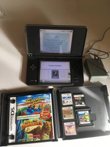 nintendo dsi xl (black) with 5 ds games and 3rd party charger some marks on bottom of handheld and possibly some yellowing on top portion of screen??(doesn't affect performance) good condition otherwise Zelda Phantom Hourglass Lego Star Wars Spore Creatures Hello Kitty Party my amusement park/digging ...