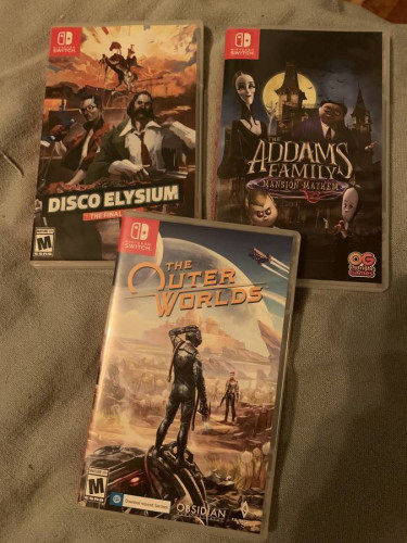 3 Nintendo Switch games for sale, all come with their original boxes. Pre-owned. Buy all for $40 or separately: Disco Elysium Final Cut - $20 (also comes with poster) The Addams Family Mansion Mayhem - $10 The Outer Worlds - $20 Open to offers!