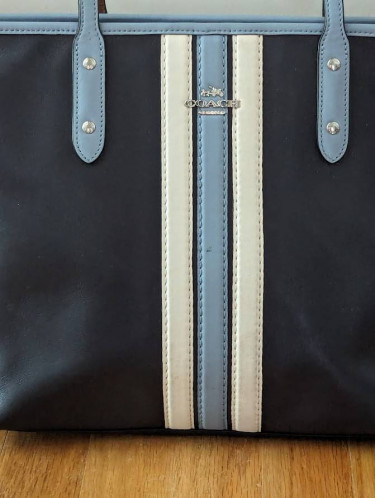 Brand New COACH Tote City Zip in a Navy Blue with light blue and cream/white stripes Purchased and put at top of closet and never used See photos for true condition of item up for sale. I have numerous items posted for sale. Search "Vintage Auto Partsss" Cash Only Local Pick Up - Woodward & 13 M...