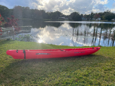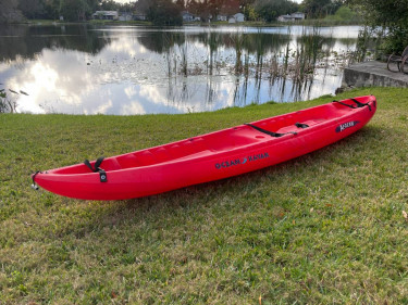 For sale is this Ocean Kayak Aegean. It is a 14', plastic kayak that is very comfortable for two adults + gear. There is even a spot in the middle where a child can comfortable sit. This boat has been in my family since ~2010 when it was purchased from the original owner. It has spent time stored inside...