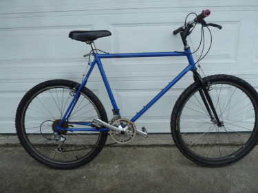 Nishiki Pueblo mountain bike, 56 cm steel frame, rattle-can painted, nice except for one scratch; riser stem, flat bars, old style big Shimano brake levers, Shimano cantilever brakes, Deore XT thumb shifters, Alivio (f) and Deore XT (r) derailleurs, 3 x 7 gearing, padded saddle, 26" knobbies. Just your basic...