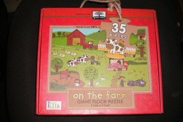 I have a giant floor puzzle, On The Farm, for sale. This has never been used and is still in its original box. It has 35 oversized pieces, which are perfect for little fingers to assemble. When completed, it measures 2 feet by 3 feet (36" x 24"). The box comes with a twine rope handle with a sample of the puz...