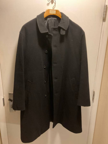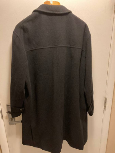 Gently used 100% Wool Overcoat, Dress Coat, Wool Coat. Private Bloomingdale's label indicates top-quality materials used and guarantees many years of usage/durability. No rips, tears, stains, odors - in amazing excellent condition. Plenty of room for wearing a sweater, scarf or suit, this solid black XL si...