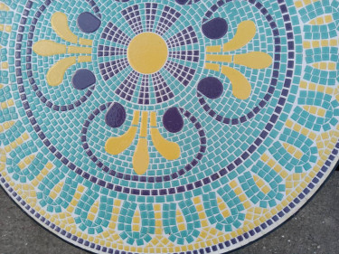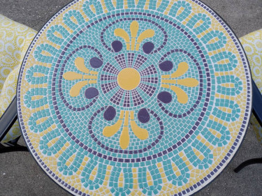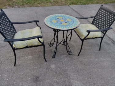 Very attractive Patio table and 2 chair set complete with 2 new cushions, looks like new The metal table top is a mosaic of blue, teal and yellow with a black base, the black chairs are as new, very strong, with new, never used yellow and white cushions, very comfortable and a great looking set for anywhere ...