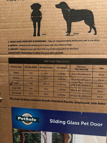 Brand new if you look at the pictures, you could see the dimensions of the doggie door. I have a golden retriever that fits through this doggie door.