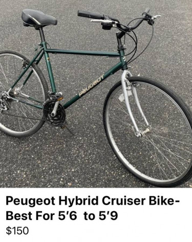 Peugeot Hybrid Cruiser Bike- Best For 5’6 to 5’9 Shifts, brakes and rides very good. 700c Aluminum rims. Comfortable saddle. 21 speeds. Well kept. $150 firm Can meet off of Rte 495/Rte 290 in Berlin, Bolton, Hudson or Stow Ma Keywords hybrid bike, hybrid bicycles, hybrid bicycle, hybrid bikes, ...