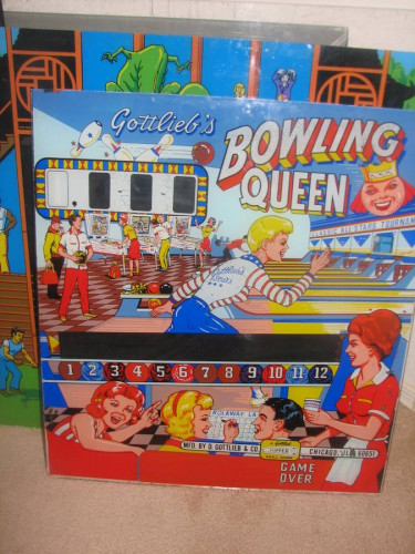 Bowling Queen back glass, crazing around white area and some missing paint spots. Still presentable. Make offer. Bullwinkle Back glass. As new Retail is 269.00 reasonable offer. Alot of arcade and pinball Manuals 10.00 each.See pics