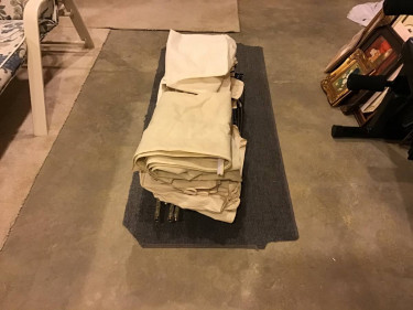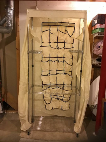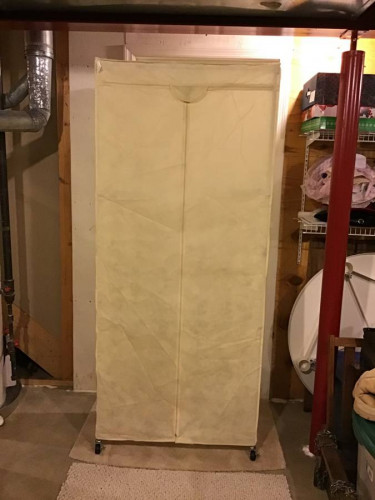 Portable Closet with Canvas Cloth light Beige Cover also zips up To keep all close clean, 75 inches height 32 inches width 15 inches depth, on wheel casters with two front ones lockable, two full shelves two small shelves two small hangers, also included 4 sets of shoe hangers and three totes bags for cloth p...