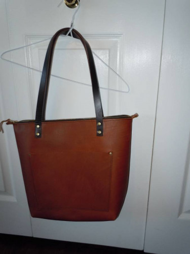Portland leather Tan and Brown leather zippered tote. Cash only. MEDIUM: Can fit a water bottle, snacks, a book, wallet, sunglasses and a 13” Macbook snugly. Measured 10.5” wide across the base, 15” wide across the top, 5.5” deep, and 12” tall.