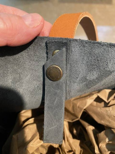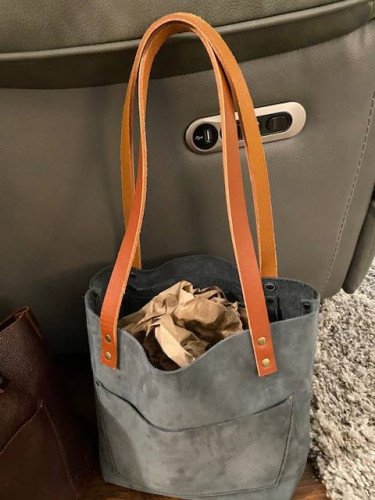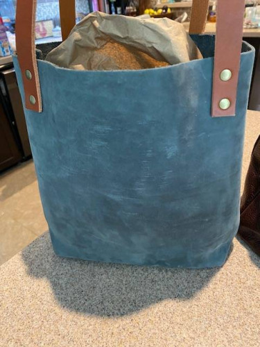 Description: This is a Storm/Tan Portland Leather Classic tote. It measures approximately 13" x 11.5". It has a small front pocket as well as an interior pocket. It has a leather key holder that snaps. It has NO ZIP top. Like New Condition.