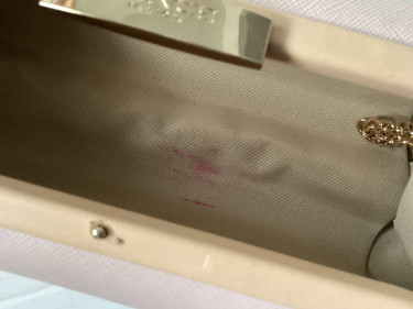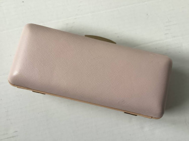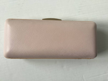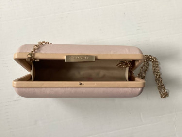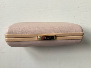 This is a dainty framed Coach harddshell case #51526. Light pink. Interior fabric lining in beige. Measures approximately 8 1/4” long x 3 1/2” height x 2 1/2” deep. Delicate textured saffiano leather. Jewelry-like detachable chair strap with 20” drop which enables it to be carried as a clutch or worn as a sh...