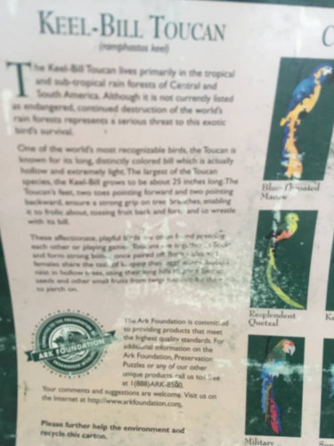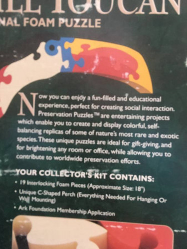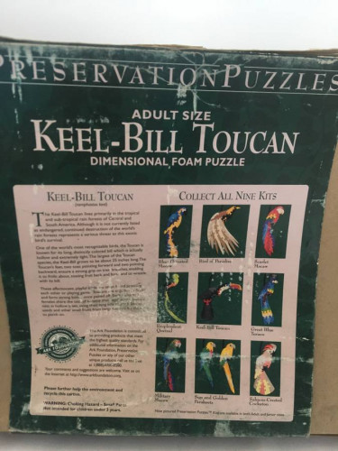 Preservation Puzzles Foam Bird Puzzle ADULT- Keel-Bill Toucan. I personally have kept these in my covered porch in my bushes for over 12 years. They withstand the elements very well. I just wash them with soap and water about once a year and they are good to go. Adds A little color and personality to the area...