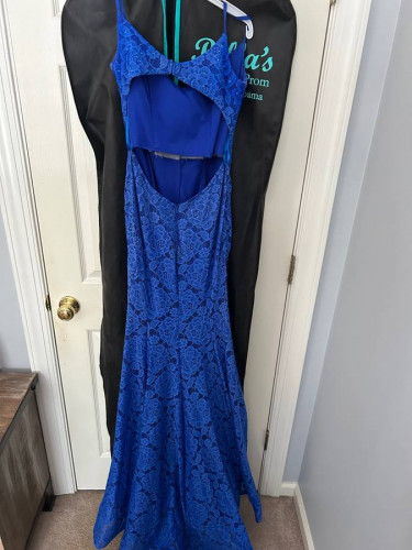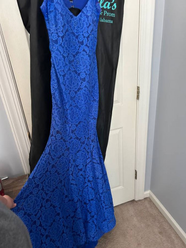 Size 4 prom dress, worn once. Material is lace but has thin material underneath so it’s not see through on the top. Has a slit to thigh area. Bottom of dress stands up so you don’t step on it.