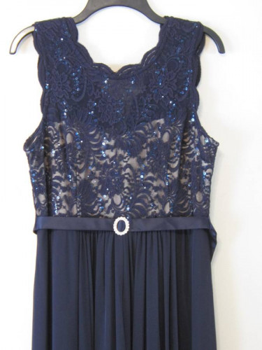 Beautiful gown in like-new condition, with tags. R&M Richards navy and taupe brocade sequined lace chiffon dress in size women's 14 Regular for a fantastic mother-of-the-bride wedding look - Lace Bodice A-Line Jewel Neck Chiffon Gown. Truly a soft, flowing gown, and extremely comfortable, for your speci...