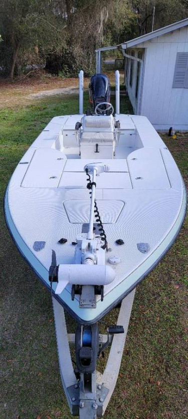 2005 Yamaha 250 HPDI, newer lower unit (1 year), new stainless prop. hydraulic jack plate, Lenco trim tabs (not working), two 8' series 2 powerpoles, Gen 3, 10" Hummingbird Solex Mega Side imaging, Minn Kota Riptide Terrova saltwater trolling motor, 112 # thrust, 36 volts. Shuttle slide trolling motor bracket...