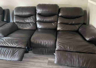Reclining Leather Sofa In a very good condition! Has cleanable marks. One is 3 seater and another is 2 seater Dimensions: 3 seater: 6 ft length 3.5 ft height 2.6 ft breadth 2 seater: 4 ft length 3.5 ft height 2.6 ft breadth Brought it from Costco
