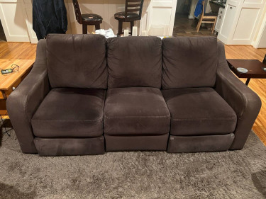 Nice living room or family room sofa and loveseat combo in good condition. Normal wear and tear. Pull the lever on each side for manual recline. Great for watching movies! No rips, cuts, burns, or permanent stains. Just a few signs of fabric fading. Recliners open flawlessly. One side of couch had a screw fal...