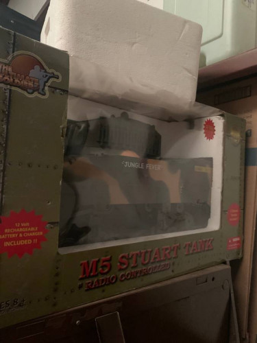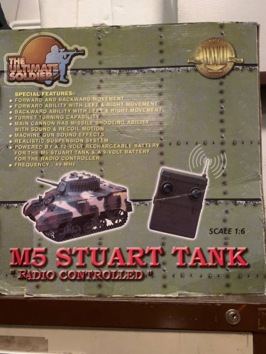 Have a New large remote control tank. It shoots a plastic missile and makes machine gun noises. The turret also turns. Has never been used but might have been taken out of the box.(The one out of the box is used and not for sale) $300