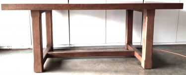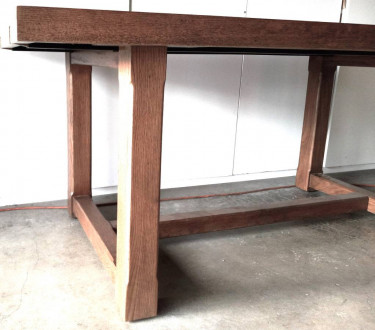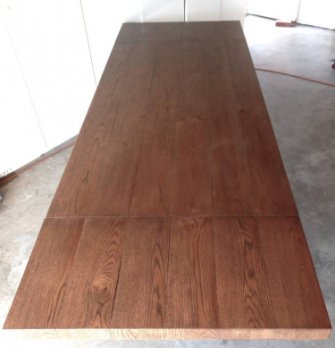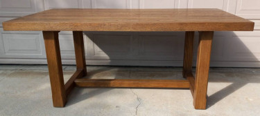 Restoration Hardware Cayden Campaign Extendable Dining Table 72" long without extensions 108" with extensions Handcrafted of kiln-dried solid oak with white oak veneers Oak is wire brushed to highlight its rich grain; a sealed wax finish enhances its color This item is artisan crafted with meticul...