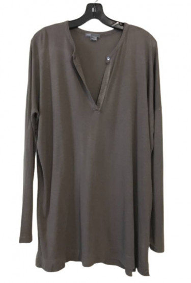 Contemporary Designer VINCE V-Neck Keyhole Single Button Pullover Boho Brown Tunic Top Shirt * BRAND: Vince * Size SMALL, runs big meant to be oversized. Could be used as a swimsuit coverup. * Color: Brown * Tunic with a hi-low hem * V-neck with button closure * Dropped shoulders * Long dolman sleeves ...