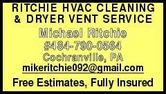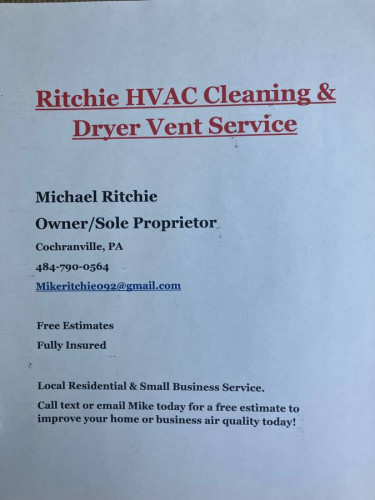 Local air duct cleaning and dryer vent service. Low rates, free estimates and discounts available! Serving most of Chester and Lancaster counties! Please call text or email today!