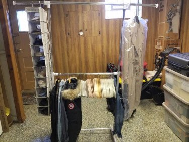 I HAVE FOR SALE THIS LIKE NEW ROLLING GARMENT RACK. TOP RIGHT AND LEFT BARS ARE ADJUSTABLE AND CAN BE SLID ALL THE WAY IN OR OUT AS PICTURED. WHEELS HAVE LOCKS IF RACK NEEDS TO BE IN A STATIONARY POSITION. RACK IS 70" TALL. TOP SECTION COMES OUT FOR EASY TRANSPORT. HANGERS AND CLOTHES/SHOES ARE...