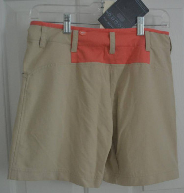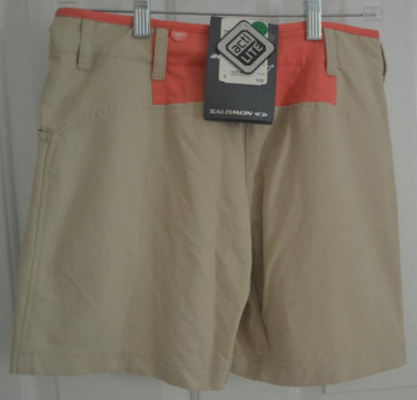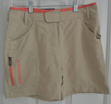 Salomon advanced skin acti lite quick dry & wicking nylon shorts. Color sand/coral. Label reads - Morphine short W Zip front with velcro tab closure and belt loops. 2 side pockets and front zip pocket. Approximately 14 inches across top and 15 inches overall length. Please provide name and ...