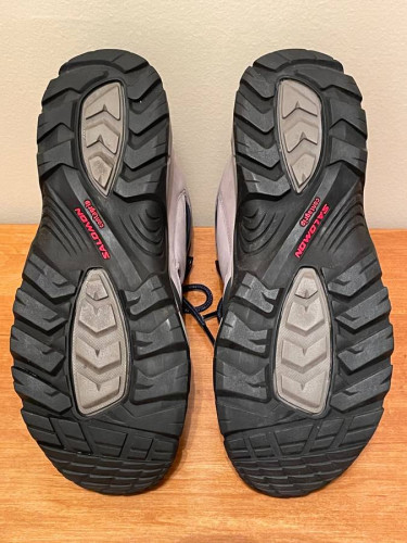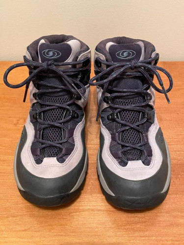 SALOMON Contragrip Women's Hiking Boots Trail Shoes Outdoor Active Footwear. Size 8.5. Light and dark gray colors, black sole. Features leather and mesh waterproof materials, soft cuffs, durable metal lace-up hooks, comfortable ankle padding, a grippy outsole that powers through uphills and descents. Th...