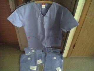 I am selling Cherokee brand Unisex V-neck Tops. I have four tops for $22 total. That equals $5.50 each. They are size large. These tops are 52" around at the armpits. All are Ciel colored. They are 65% polyester and 35% cotton. They have one chest pocket and two patch pockets. They are all new,...