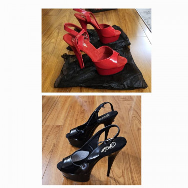 Here are two pairs of (woman-sized) Pleasers Heels; the descriptions are as follows: DEL609/RM Color: Red Size: 9 (women) 6" Heel, 1 3/4" Platform Ankle Strap Sandal 6" (15.2cm) Stiletto Heel, 1 3/4" (4.5cm) Platform Peep Toe Ankle Strap Sandal https://pleasershoes.com/products/delight-609rm?_pos=...