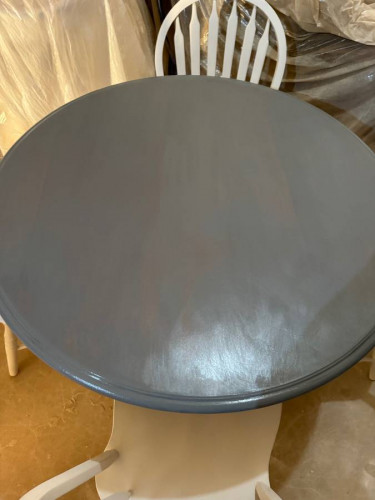 Completely Refinished small round Farmhouse Style kitchen table Set. The chairs and table base were done in Arctic Cotton. Table top is done in weathered gray all poly protected twice. - [ ] Selling as a SET ONLY: Table (there is NO leaf the diameter is 42”) 4 Windsor style chairs. (WILL NOT SEPARATE). Very...