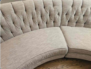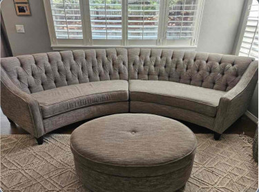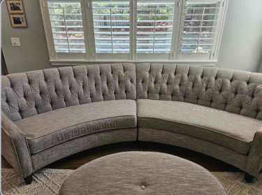 Excellent couch for your living room. Only two weeks used, steam cleaned and ready to go! Gray and cream color threads. Very neutral. Takes up about 138 inches of wall space but keep in mind it is a curved shape