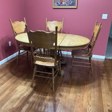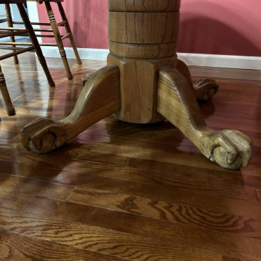 Vintage solid oak dining set circa 1970s. Pressed back chairs Carved claw foot pedestal Table has 2 removable leaves. Tabletop shows signs of wear and a few watermarks. Been in the family since new. Could be a fun refinishing project. Width w/both leaves - 72” Diameter without leafs - 48” ...