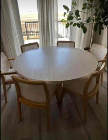 57" diameter round dining table. Custom made solid plywood topped with a sheet of birch plywood, legs and table edge are finished with laminated birch wood. Entire table is stained with aged white. It stands 29" tall, table edge is 1.675" thick and the top is removable from legs.