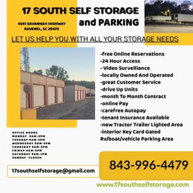 At 17 South Self Storage, we offer a wide variety of storage units and parking spaces in multiple sizes. Whether it's storing your lawn furniture, household items, vehicles, or business equipment and excess, we have a unit or space for all you're storing needs!! 13 x 30 parking and 8 x 10 storage units...