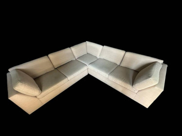 Beautiful beige modern designer corner 2pc. sectional sofa in amazing condition! One previous owner had it in clean, no pet/non-smoking home. Professionally deep cleaned and sanitized. No rips, tears, odors or stains. A few minor discolorations but overall beautiful amazing shape. Retailed new for ...